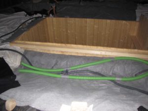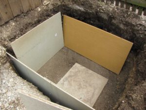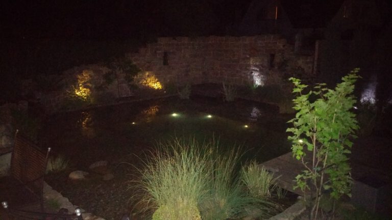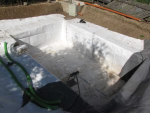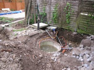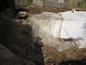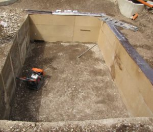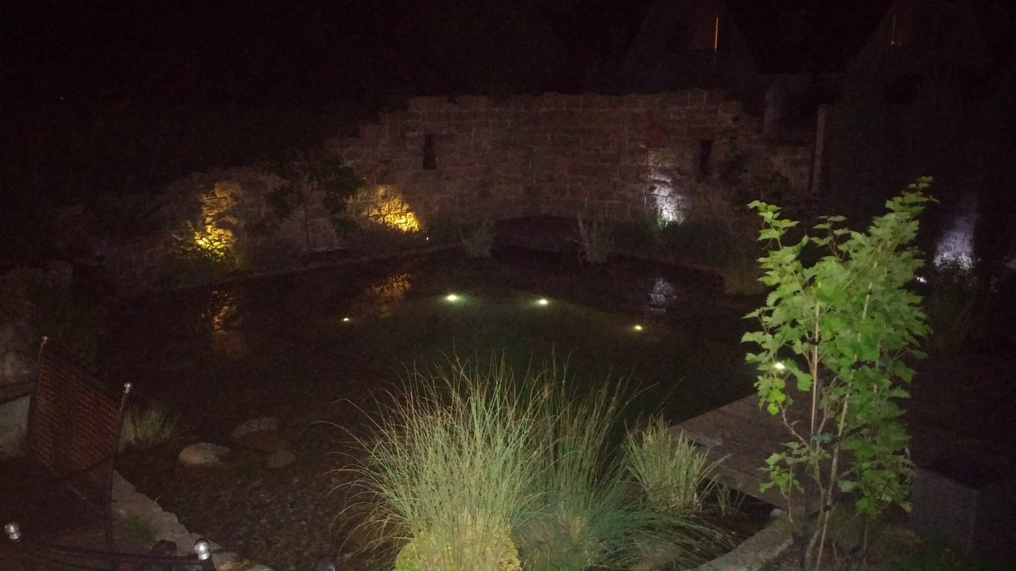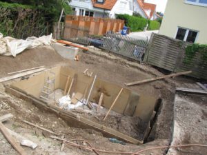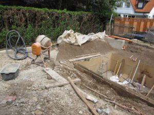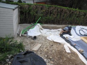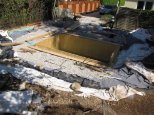 Die Technik betrifft hauptsächlich Elektronik und Pumpentechnik – aber auch Filter und Licht. Das bzw. die Steuerung kam alles in den Technikschacht. Dafür wurde am Rand des Teichs eine Grube ausgehoben und (mit den nötigen Rohren für Anschlüsse und Verbindung nach Außen) betoniert.