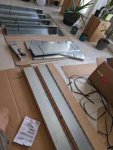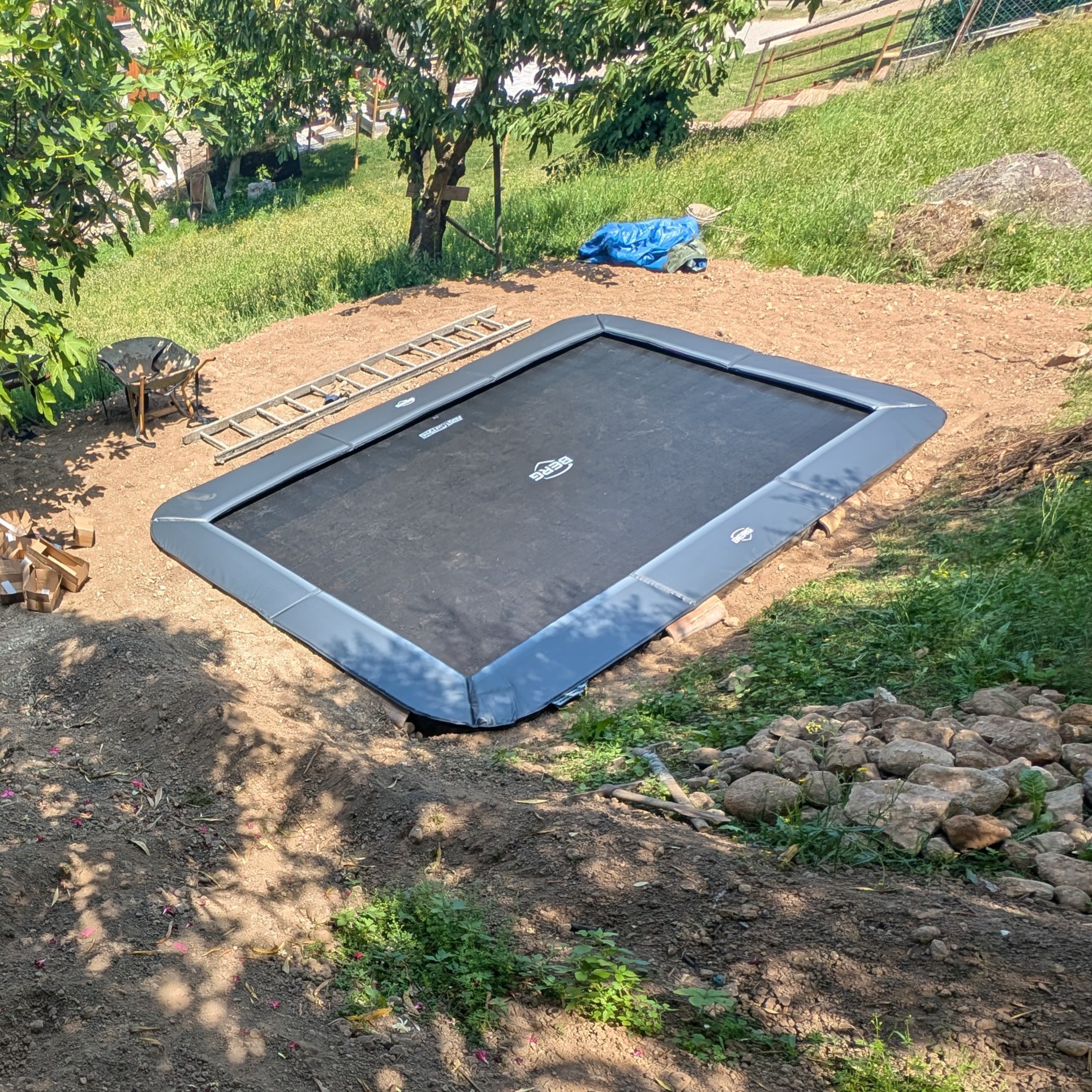 Rahmen aufbauen ist auch etwas schwieriger als beim Überbodentrampolin, weil die einzelnen Elemente wuchtiger und schwerer sind. Hat aber auf Umwegen und mit Hilfsmitteln alleine funktioniert – auch wenn Herstellerseitig 2-4 Personen zur Bearbeitung als benötigt angegeben werden.