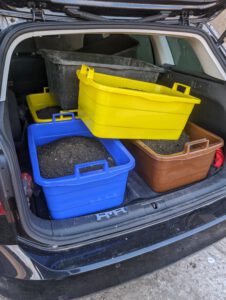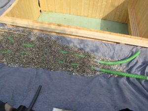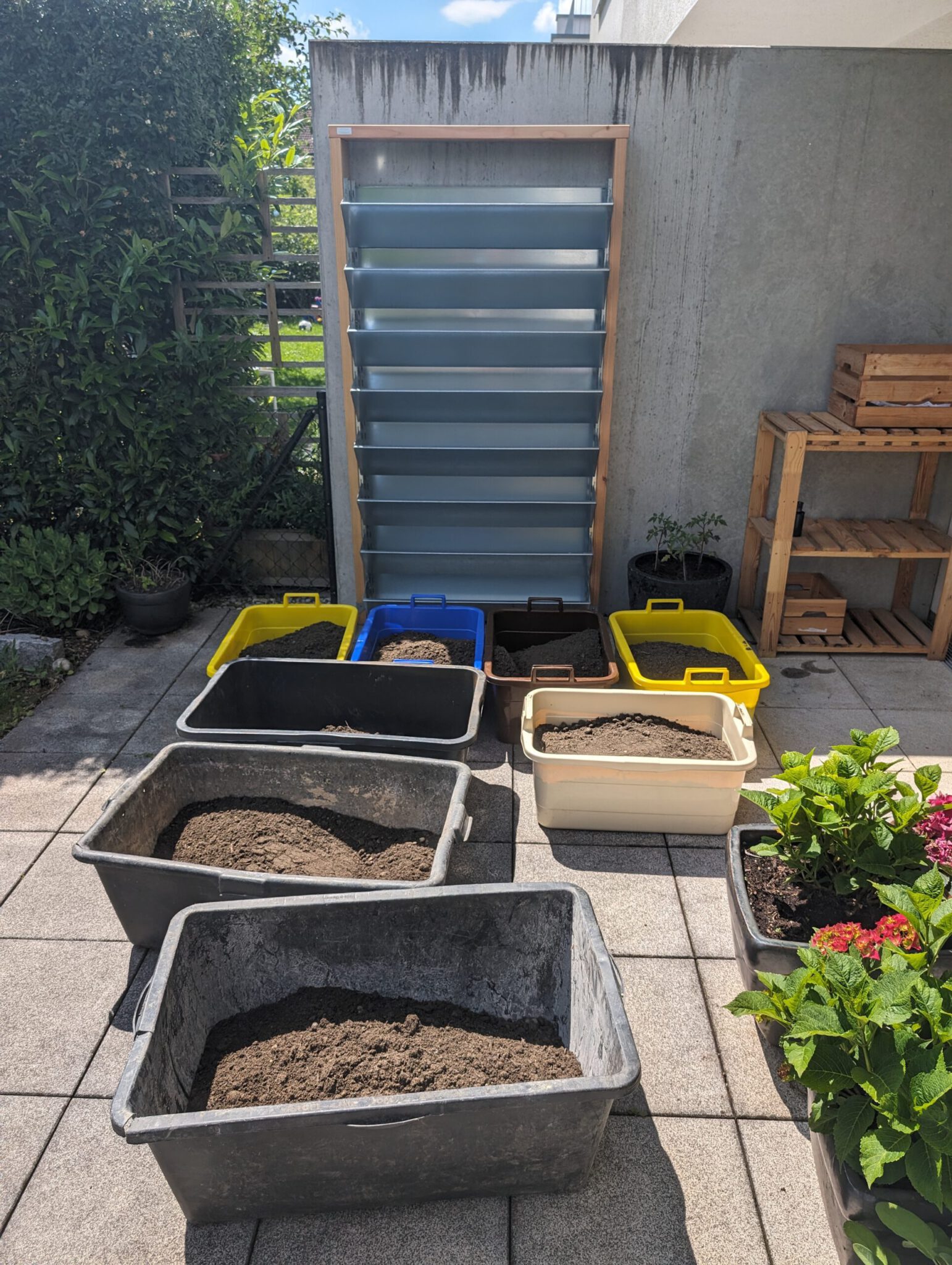 Zum befüllen habe ich Erde mit großem Humusanteil verwendet (geholt bei einem großen Garten- und Landschaftsbauunternehmen), sowie zusätzlich ca. 40kg Erde für Gemüsepflanzen vom Baumarkt