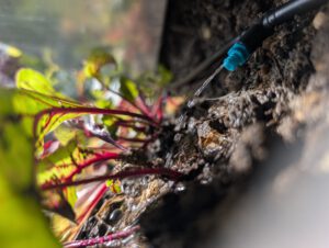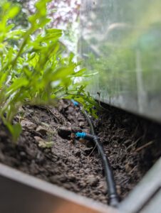 Ich habe dafür ein Gardena Set (mit Druckminderer, Schlauch und diversen Kleinteilen) besorgt, mir das zusammengebaut und an einen simplen Bewässerungscomputer (noname) angeschlossen.