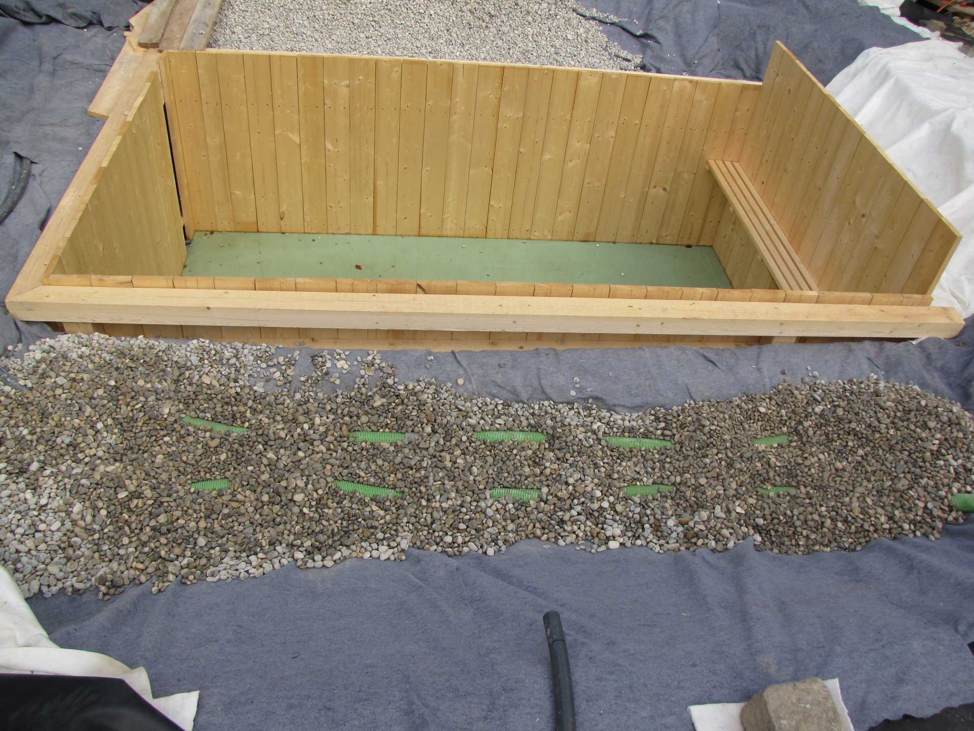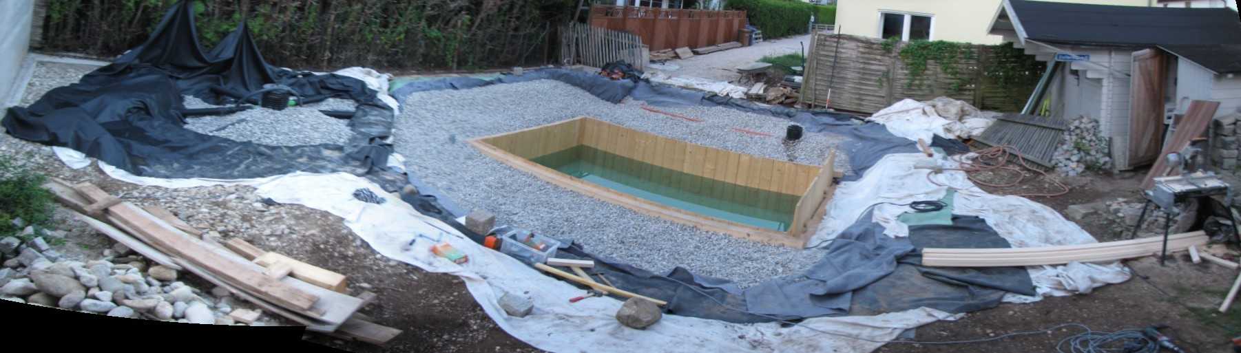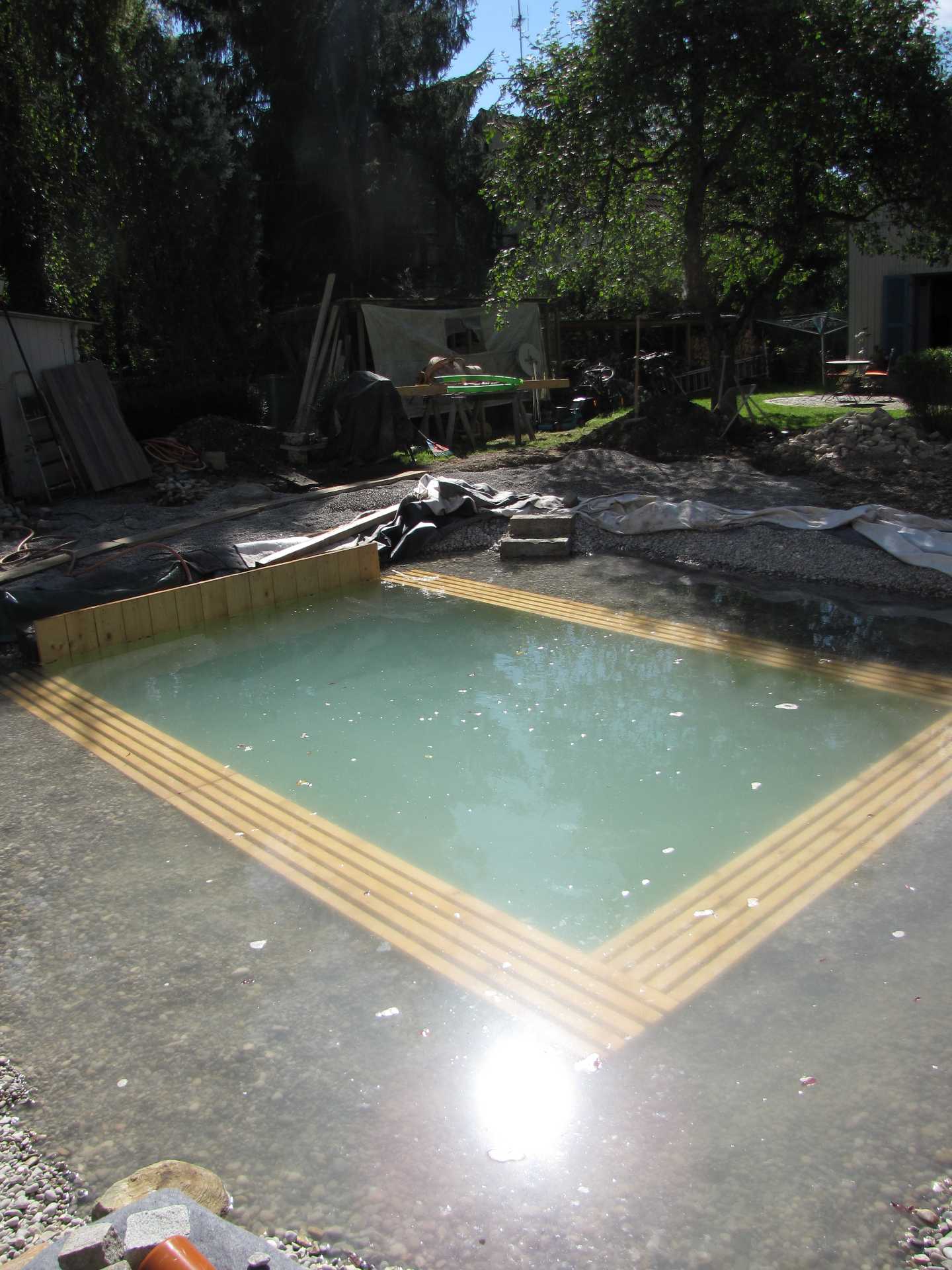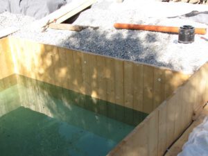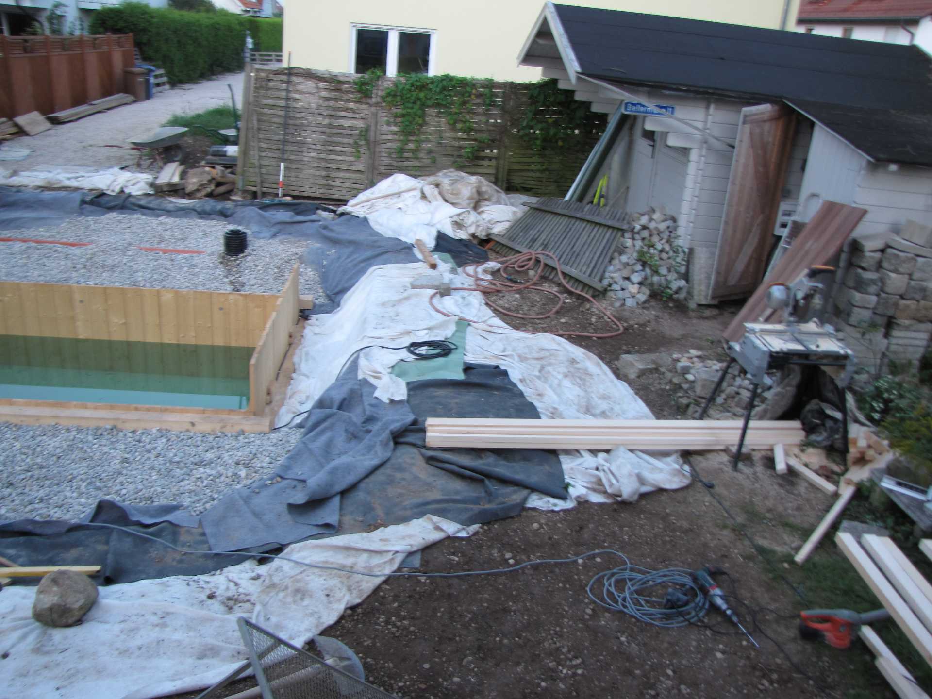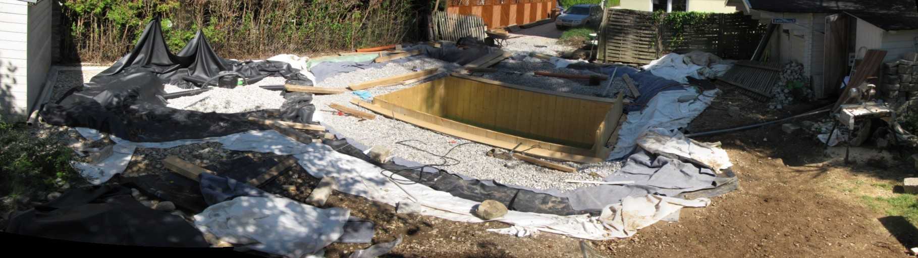 Also alles Wasser wieder ausgelassen, ein paar Tonnen Kies geholt und hinter die Holzkonstruktion gefüllt. Das hat geholfen und der nächste Wassertest wurde erfolgreich bestanden.
