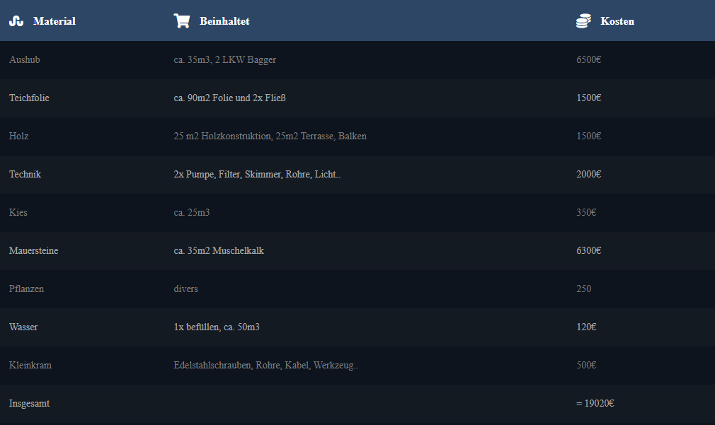 Damals haben wir uns einige Teiche angeschaut, um Ideen zu sammeln. Ein besonders schöner (mit Edelstahlverkleidung an den Seitenwänden im Schwimmbereich, gefließtem Boden, 2 Skimmern.. und großem Naturstein als Quellstein) lag bei 100.000€. Wir dachten mit Baukosten lägen wir bei einem Folienteich bei rund 12000-maximal 15000€, aber es wurde dann schnell mehr 😂